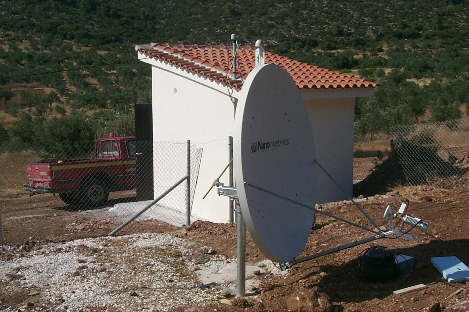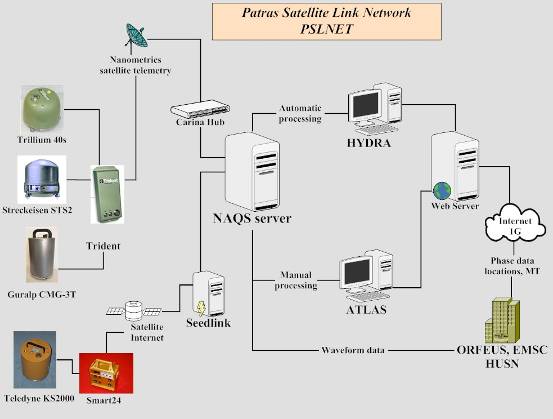 Network description -central station Remote stations transmit data, (100Hz sampling rate, continuous records) to central Hub that is located in the University of Patras campus. This device is taking care of all data transmission by distributing the available bandwidth among remote stations, based on the TDMA protocol. The satellite system operates in Ku-band and currently the HellasSat satellite is in use. The performance of the telemetry system is very good and it efficiently balances cost with data retrieval. Similar to acquisition system, the user has full control on the telemetry system also, thus state of health monitoring and parameter change is quite easy. The central Hub receives data packets and then forwards them through local network to NAQS server acquisition software. This is an acquisition and data handling software package that performs the following tasks: data storage in ring buffer files, state of health data storage, waveform and state of health data real time display, data error handling and retransmission request, triggering of events and access to ring buffer data for clients like e.g. picking software. Ring buffer files store continuous data and are copied on backup disks once per day.