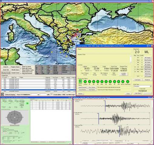 Manual ProcessingThe Nanometrics Atlas software is used for manual data processing (Fig.3), this means phase picking, epicenter location and magnitude determination. Results are stored in a MySQL database and are accessible through the Internet. The Hypoinverse program is used by Atlas for the determination of epicenter and the calculation of event magnitude. Two types of magnitudes are used; the duration and local magnitude using the Eaton, 1992 formula, implemented in Hypoinverse. Moment tensor solutions are calculated in the case of an event with M>4.0, using the ISOLA-GUI code (Sokos and Zahradnik 2008). The location and moment tensor results of the manual analysis are posted immediately at the EMSC web page, while in case of strong events a small report is prepared also. Examples of these reports, include the Leonidio earthquake (08/01/06, Mw6.2) and the Andravida earthquake (08/06/08, Mw6.4).